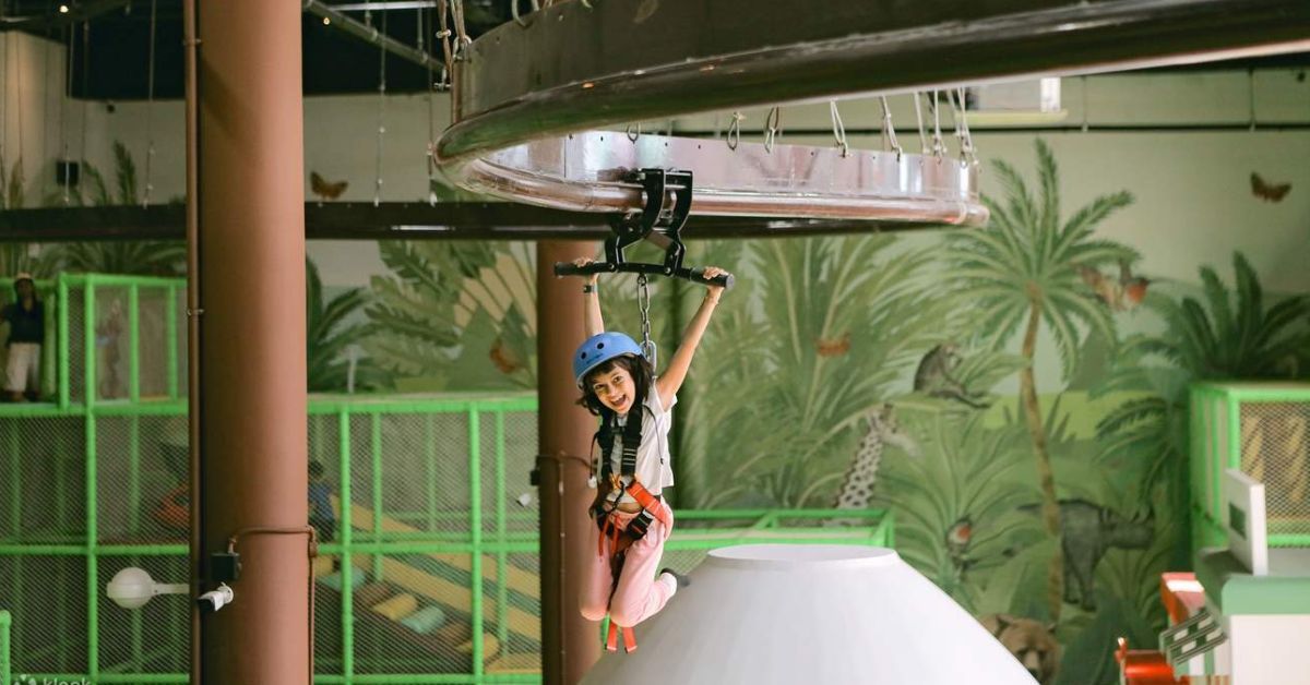 The facility spans both indoor and outdoor play areas, giving families options regardless of weather conditions. The indoor section features imaginative role-play zones, soft play areas, ball pits, slides, Lego stations, a zip line, and interactive screens where kids can throw balls at trampolines. Outside, children discover an adventure-filled playground with climbing structures, a flying fox, and more physical activities.