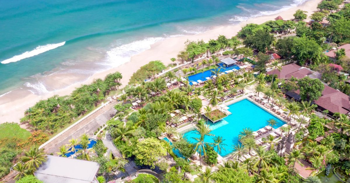 Directly on the sand of Legian Beach, this resort is known for its Balinese-style architecture surrounded by tropical vegetation. Guests enjoy spacious villas, two lagoon-style pools, and excellent restaurants with oceanfront views. It's a true Bali beach escape.